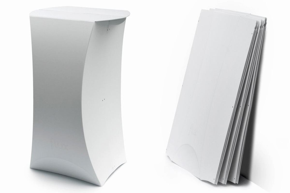 Mesa de centro alta ideal para ferias, promociones y todo tipo de eventos. Está disponible en dos colores. Su ingenioso diseño hace que la mesa se transporte plana.