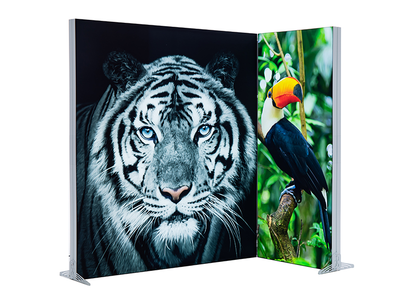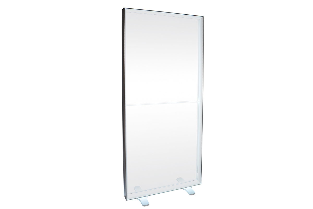 Podemos colocar una tela especial reflectante de la luz en la parte posterior del marco y una tela impresa en la parte frontal. El color neutro de los Leds (6000 Kelvin) hace que sus gráficos queden perfectos de color.