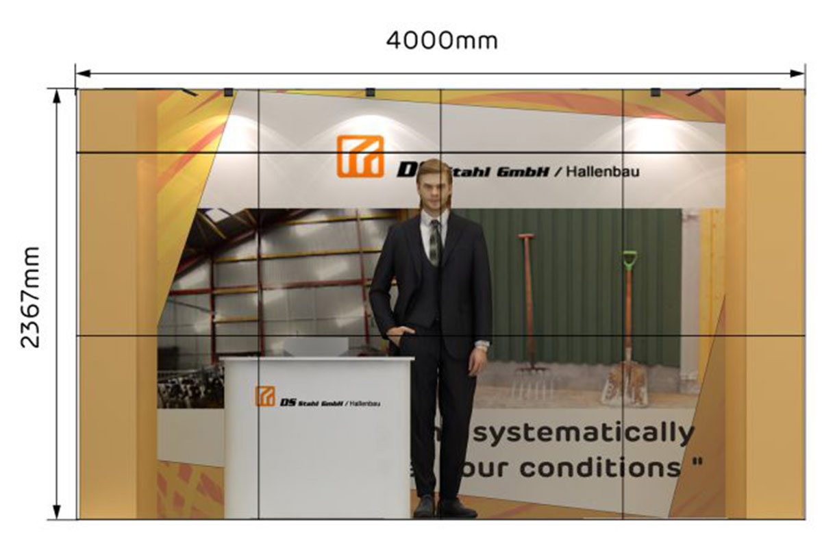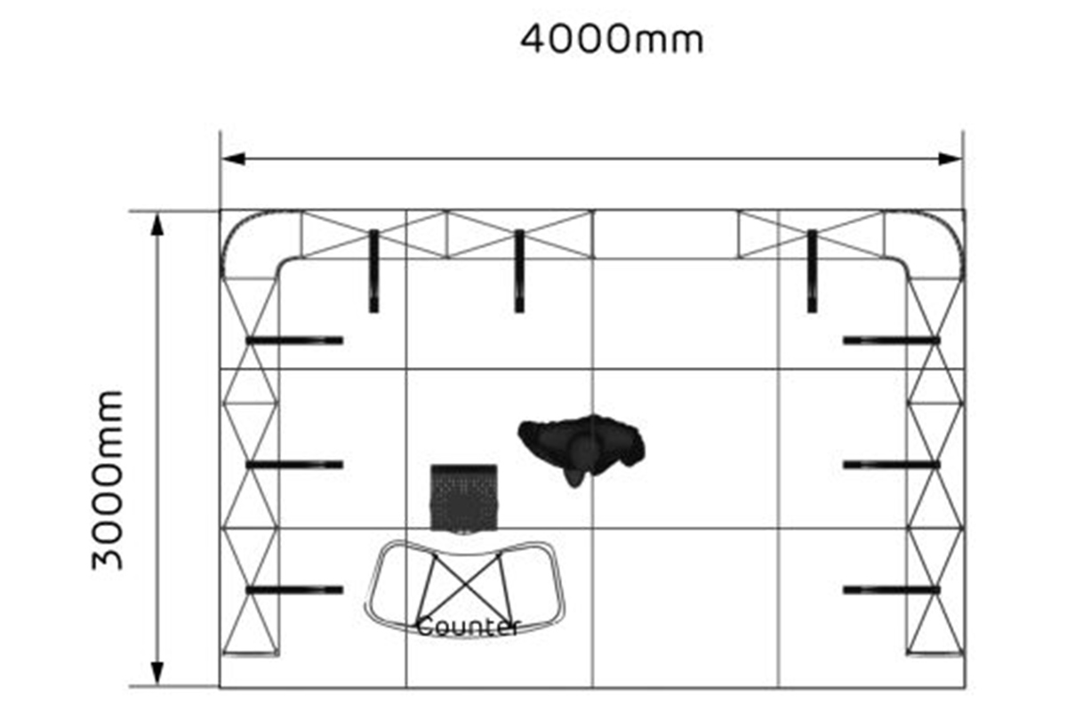 Con una longitud de 4m. y un ancho de 3 m. este stand de 12 m² tiene un diseño abierto y es ideal para presentar sus productos y servicios en ferias.