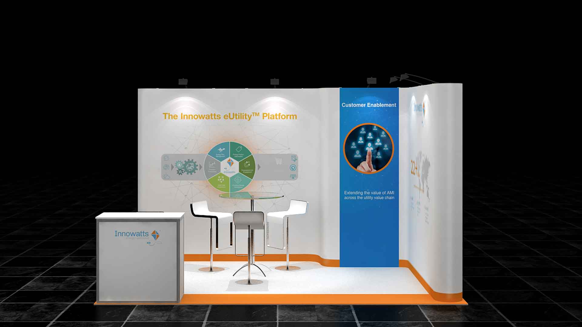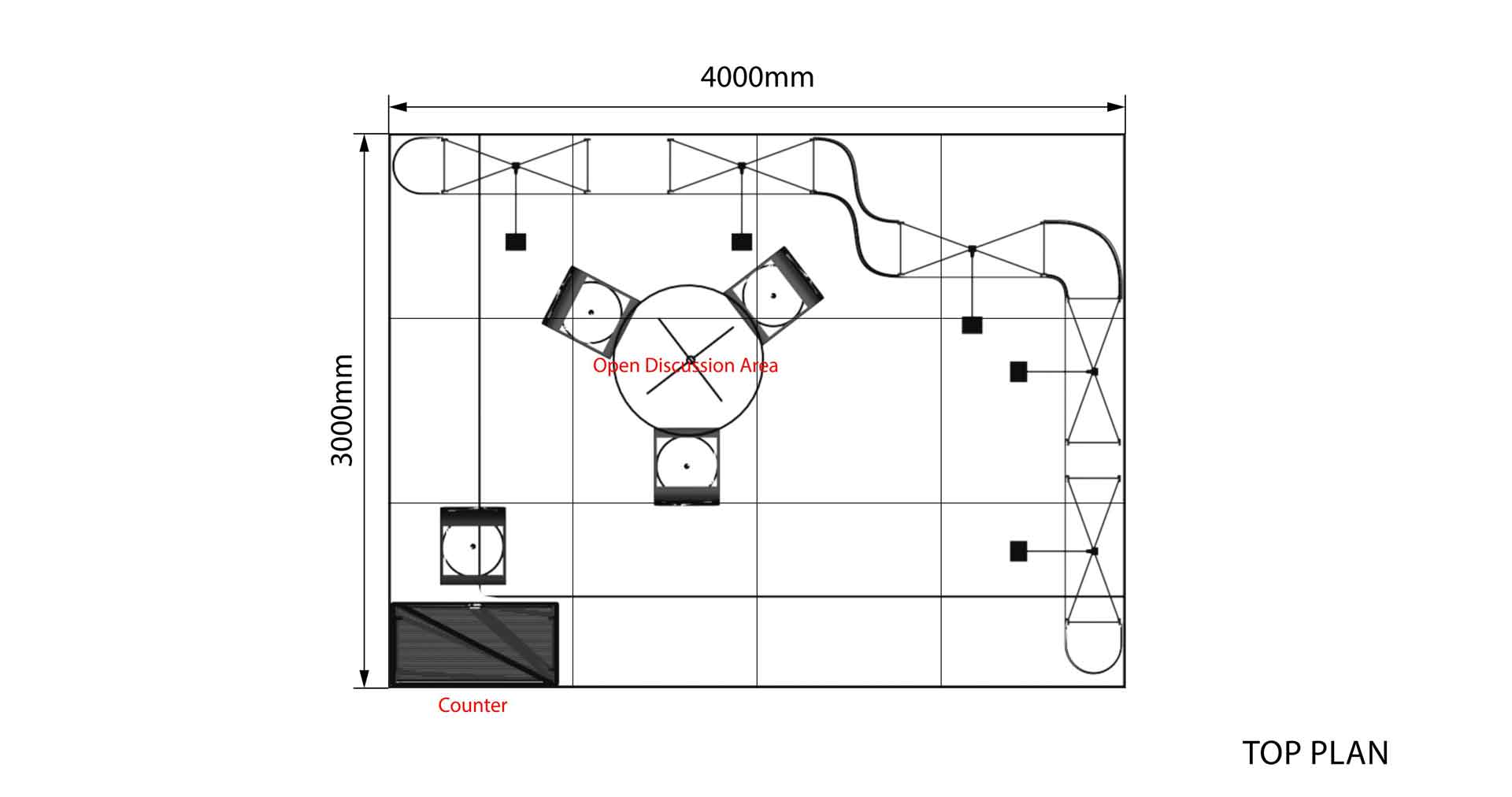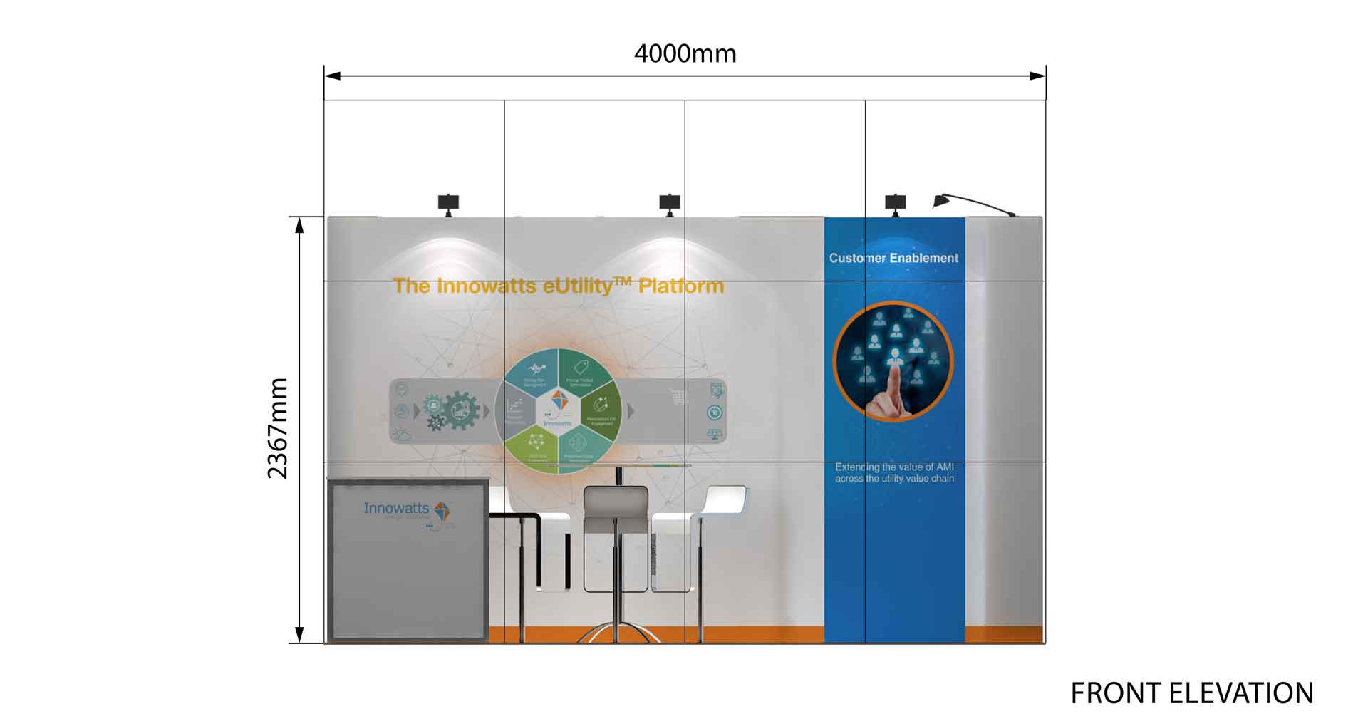 Con una longitud de 4m. y un ancho de 3 m. este stand de 12 m² tiene un diseño abierto y es ideal para presentar sus productos y servicios en ferias.
