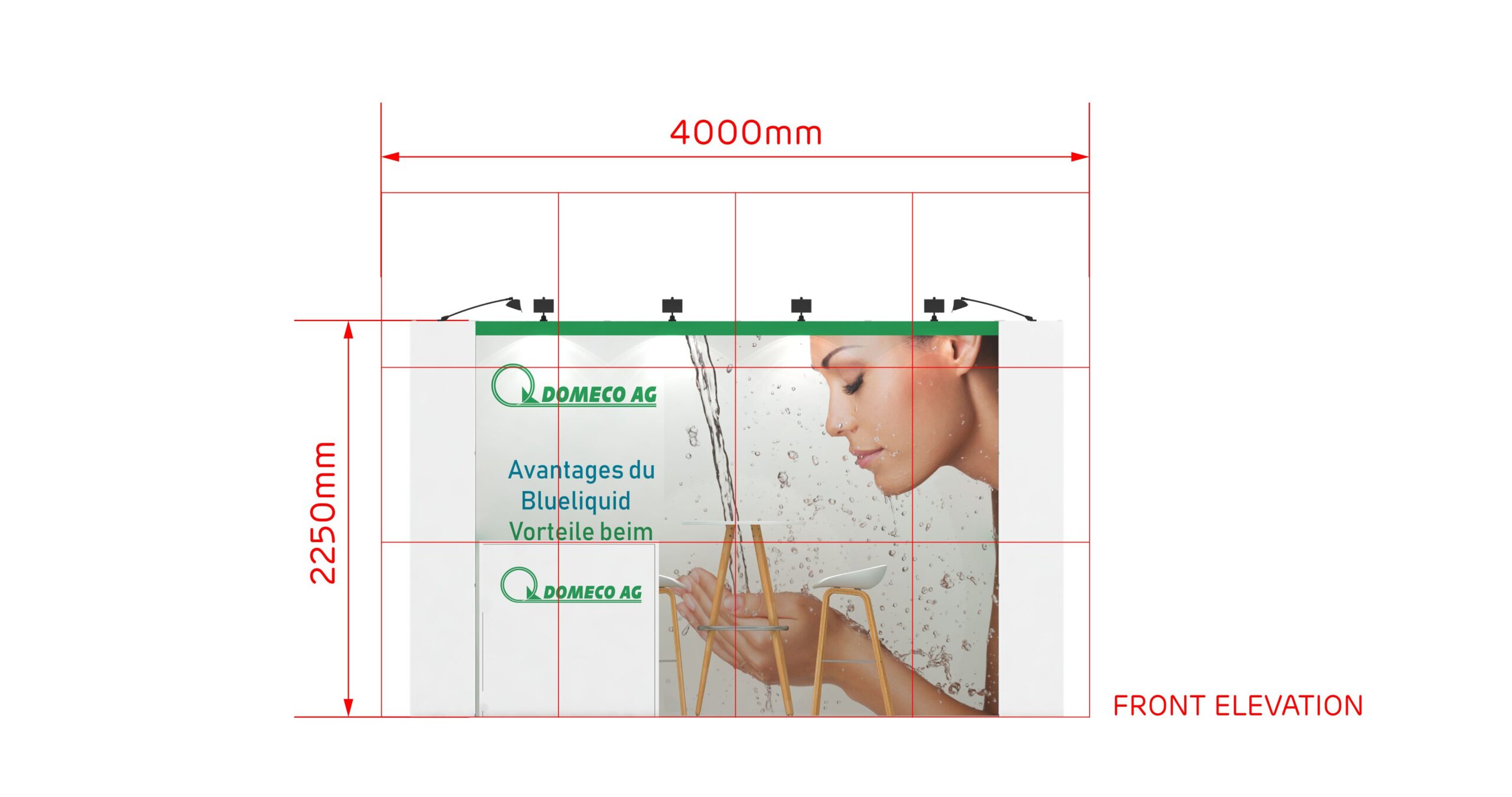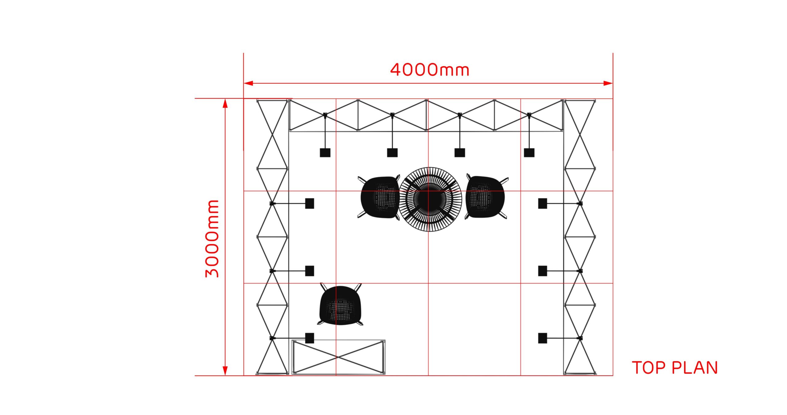 Con una longitud de 4 m. y un ancho de 3 m. este stand de 12 m² tiene un diseño abierto y es ideal para presentar sus productos y servicios en ferias.