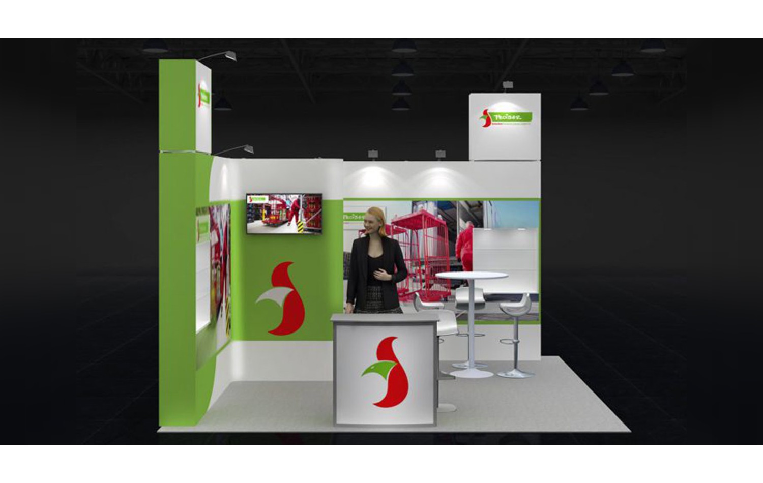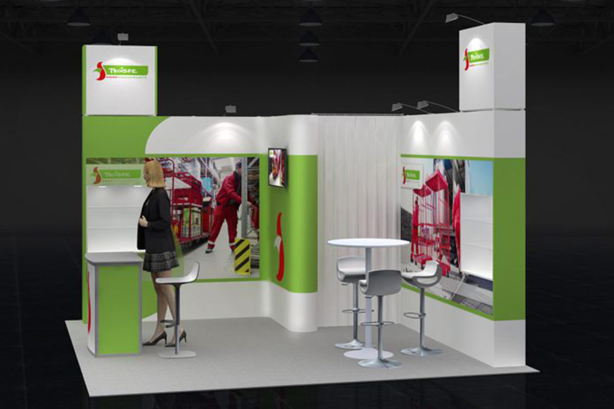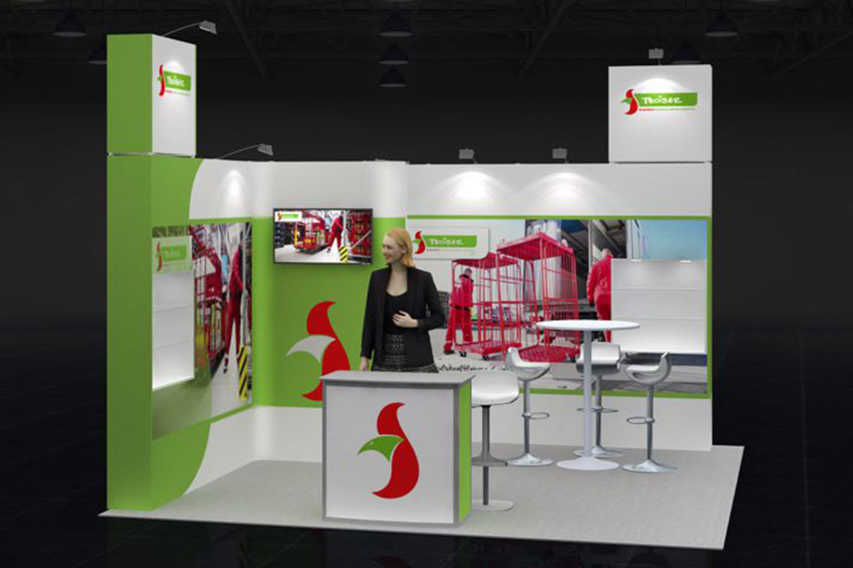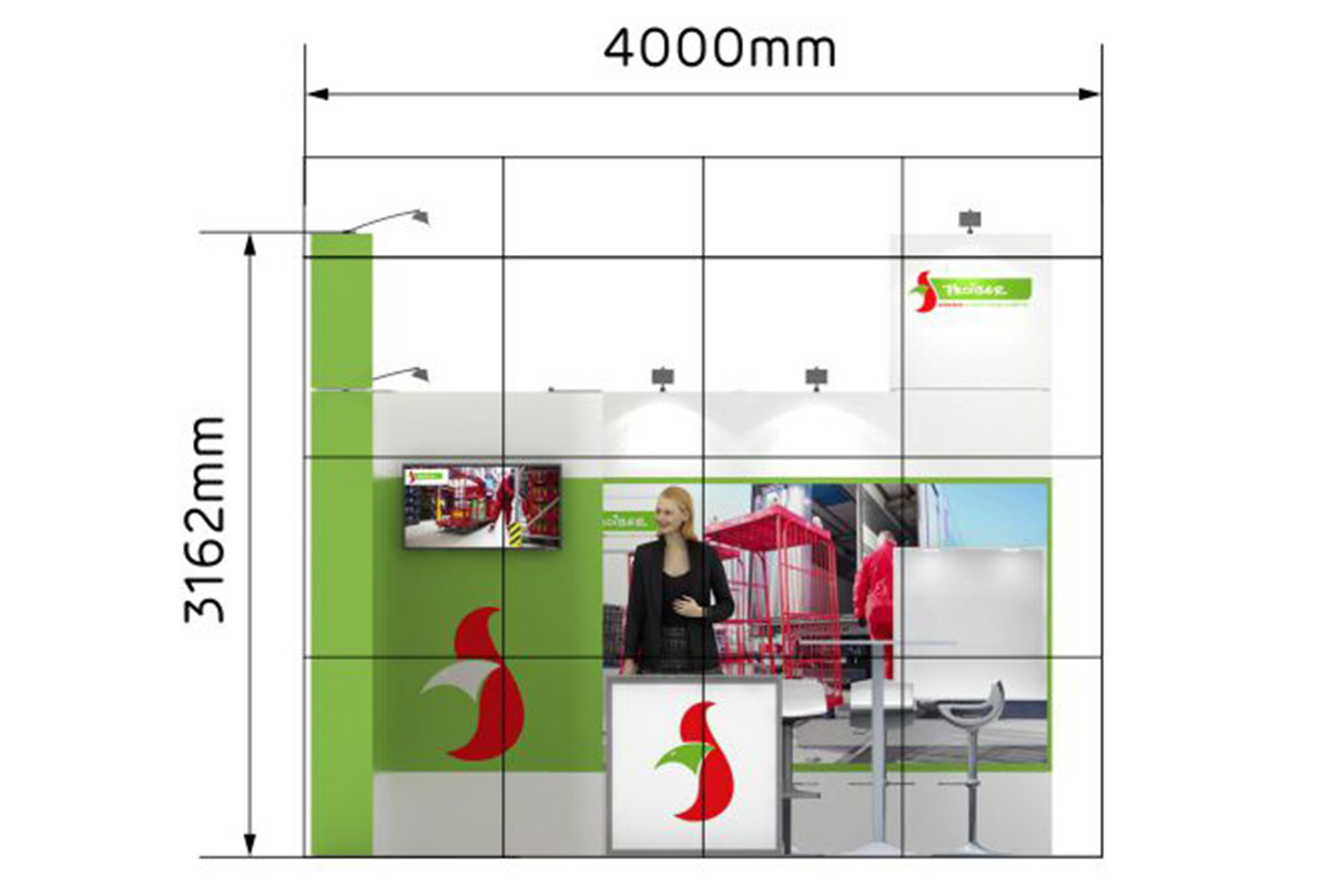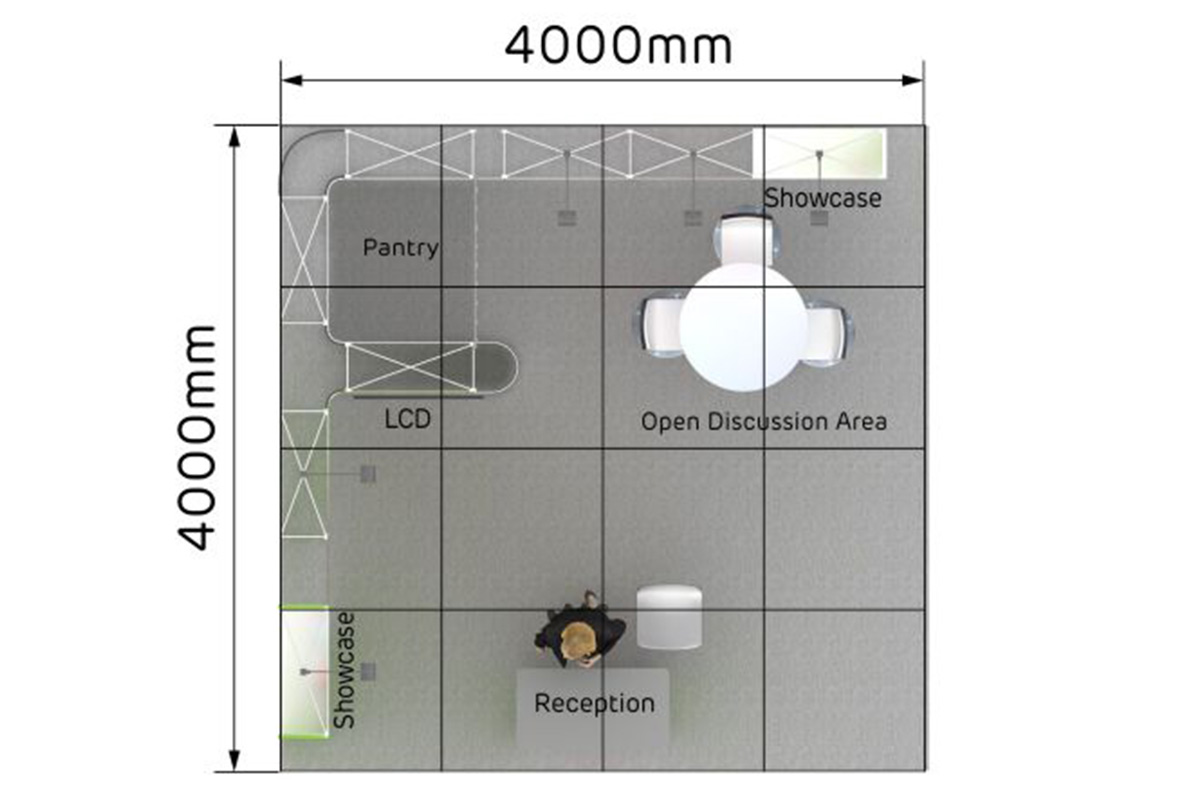 Con una longitud de 4 m. y un ancho de 4 m. este stand de 16 m² tiene un diseño abierto y es ideal para presentar sus productos y servicios en ferias.