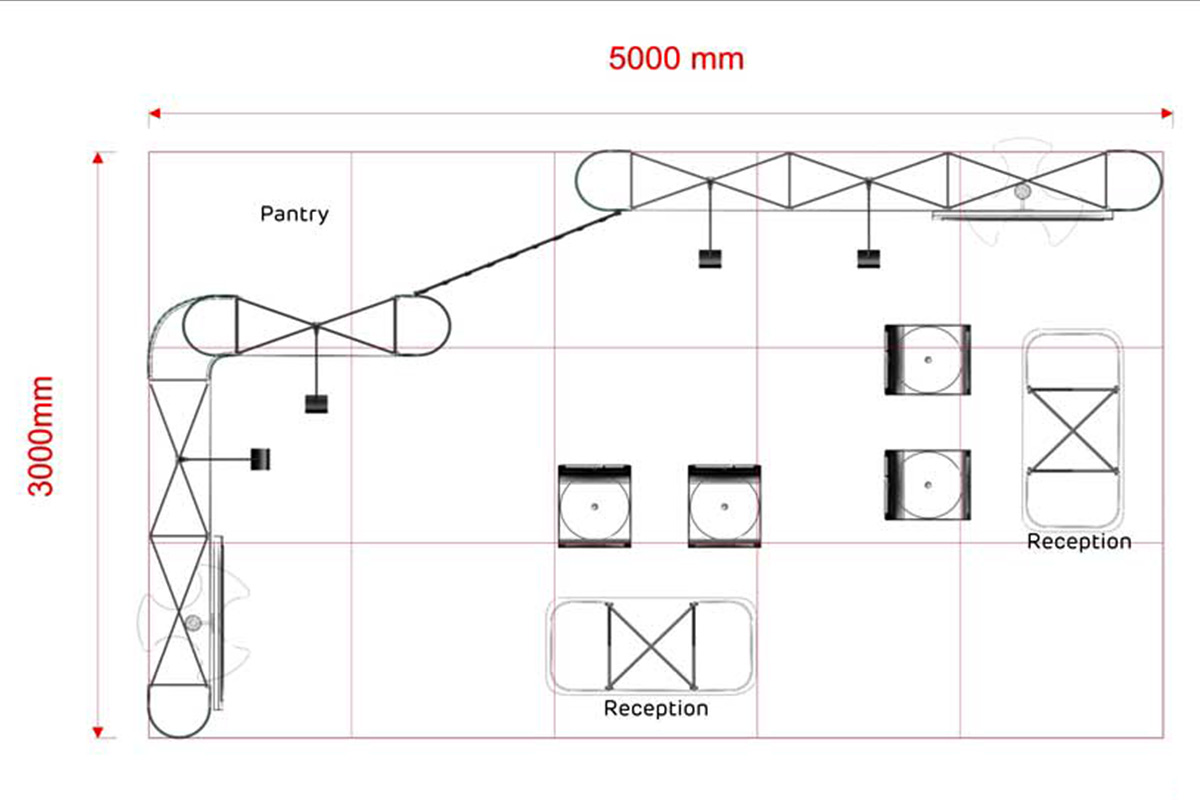 Con una longitud de 5m. y un ancho de 3 m. este stand de 15 m² tiene un diseño abierto y es ideal para presentar sus productos y servicios en ferias.