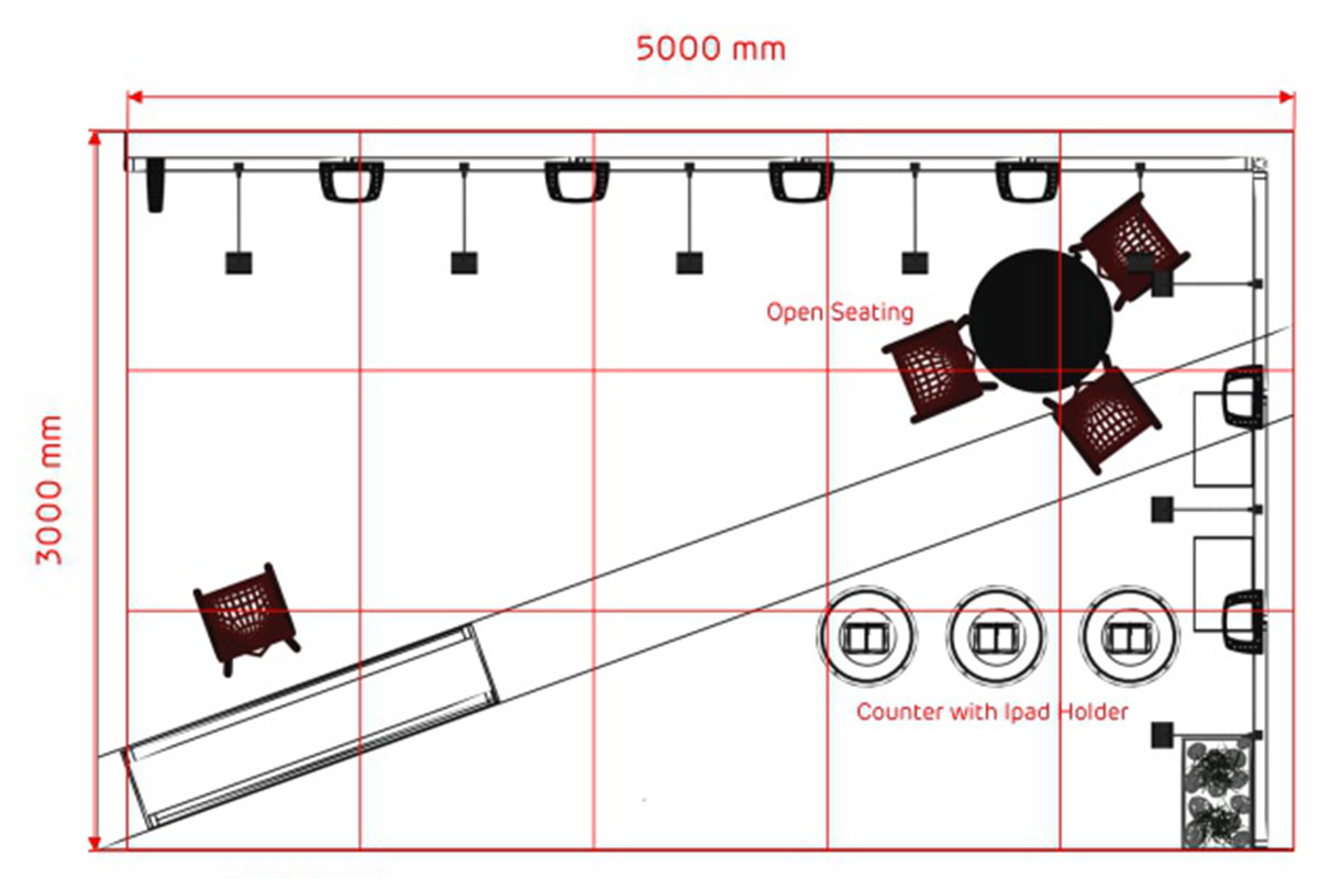 Con una longitud de 5 m. y un ancho de 3 m. este stand de 15 m² tiene un diseño abierto y es ideal para presentar sus productos y servicios en ferias.