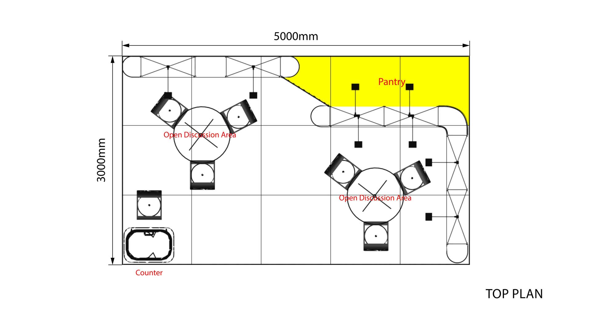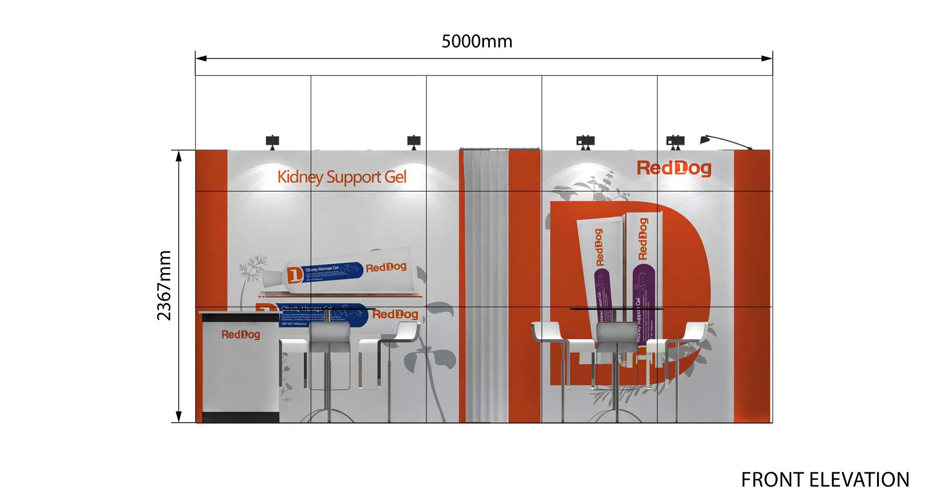 Con una longitud de 5m. y un ancho de 3 m. este stand de 15 m² tiene un diseño abierto y es ideal para presentar sus productos y servicios en ferias.