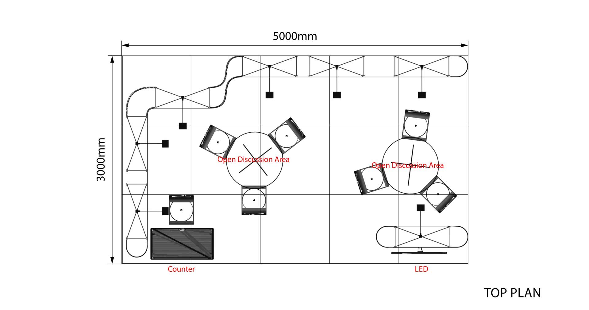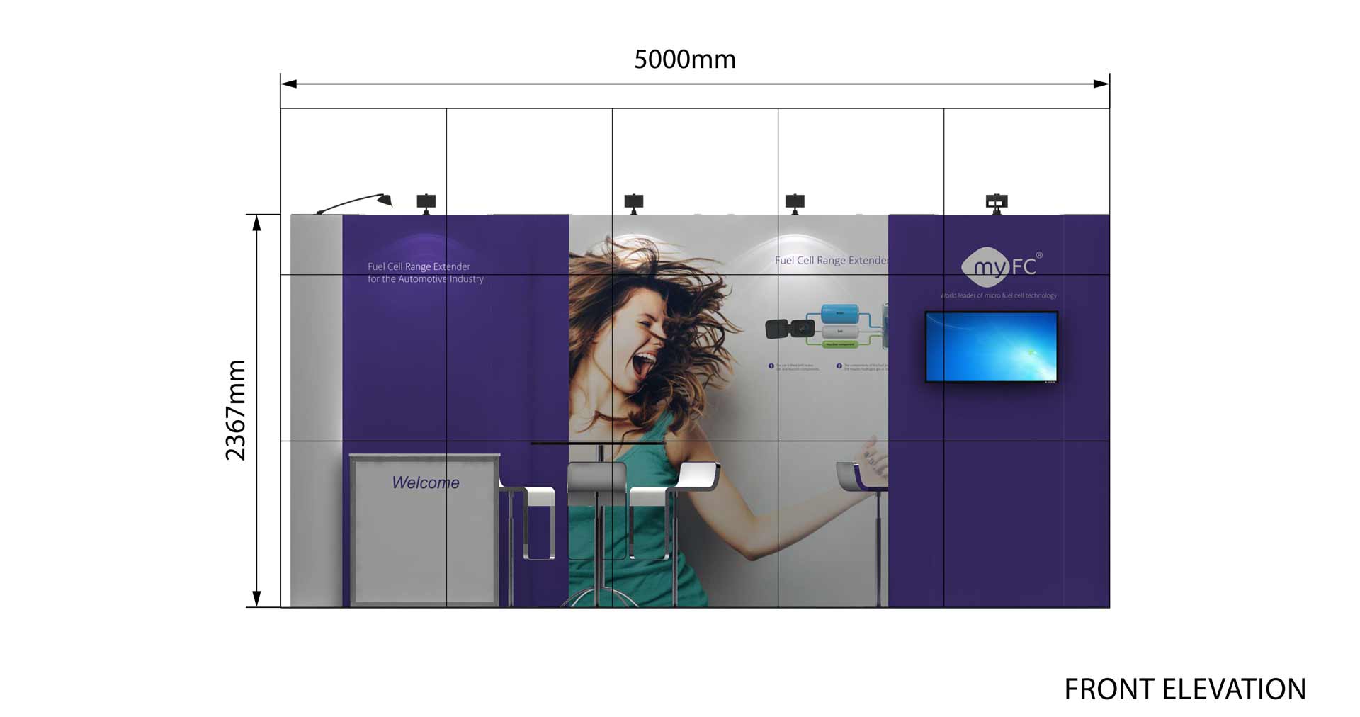 Con una longitud de 5m. y un ancho de 3 m. este stand de 15 m² tiene un diseño abierto y es ideal para presentar sus productos y servicios en ferias.