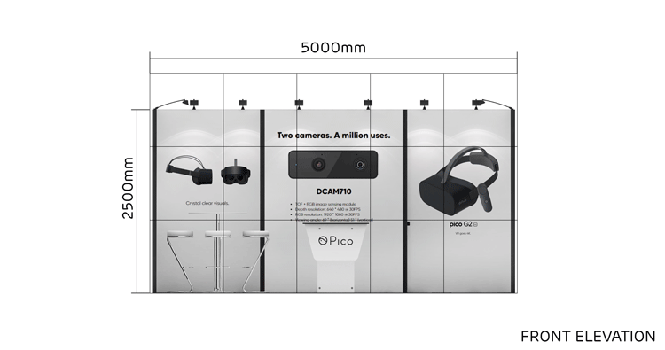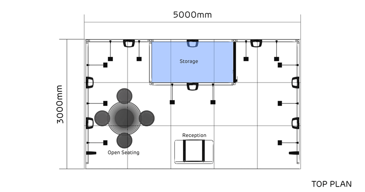 Con una longitud de 5 m. y un ancho de 3 m. este stand de 15 m² tiene un diseño abierto y es ideal para presentar sus productos y servicios en ferias.