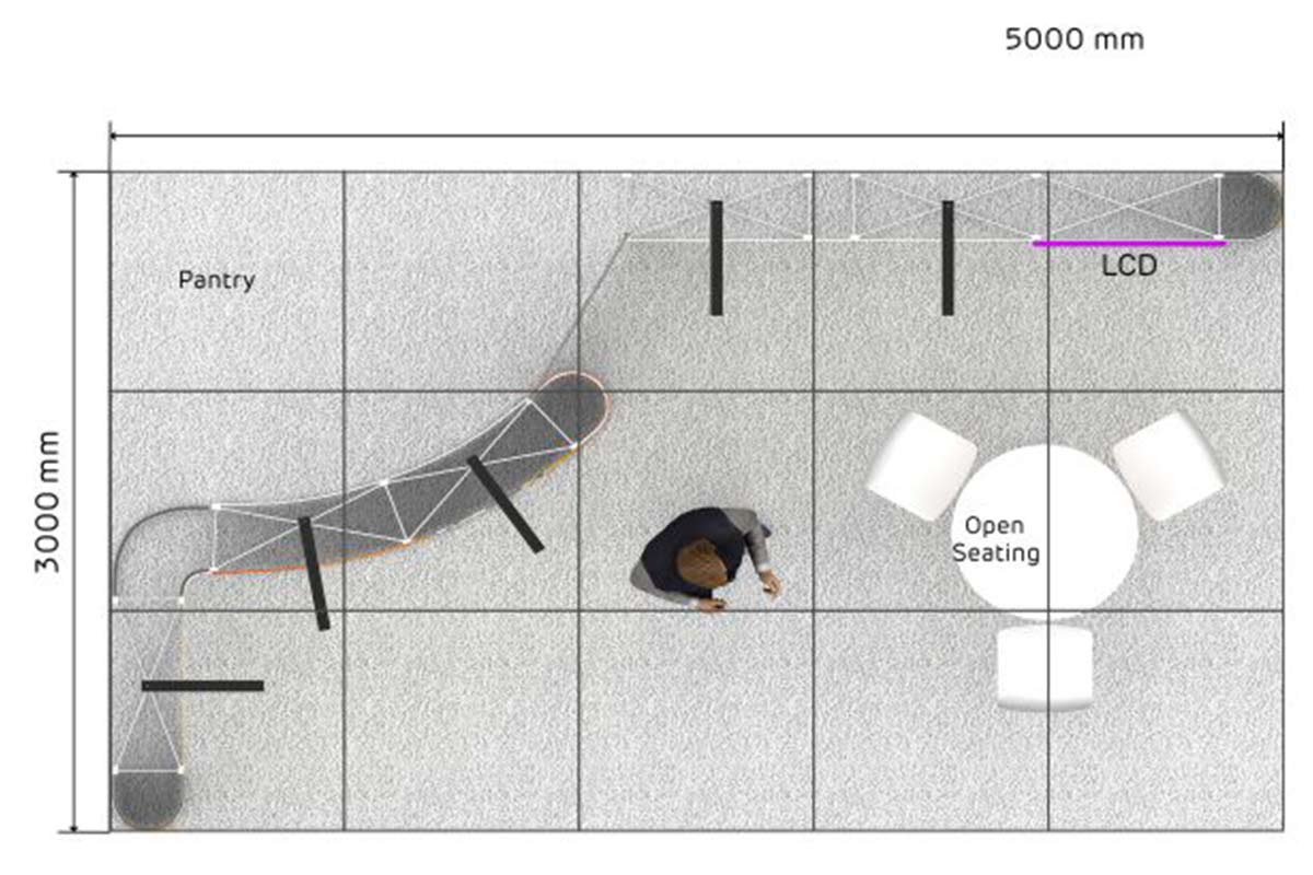 En este ejemplo se ha creado un área de almacén utilizando una cortina. Se ha integrado una pantalla de vídeo y hay una zona de reunión/trabajo.