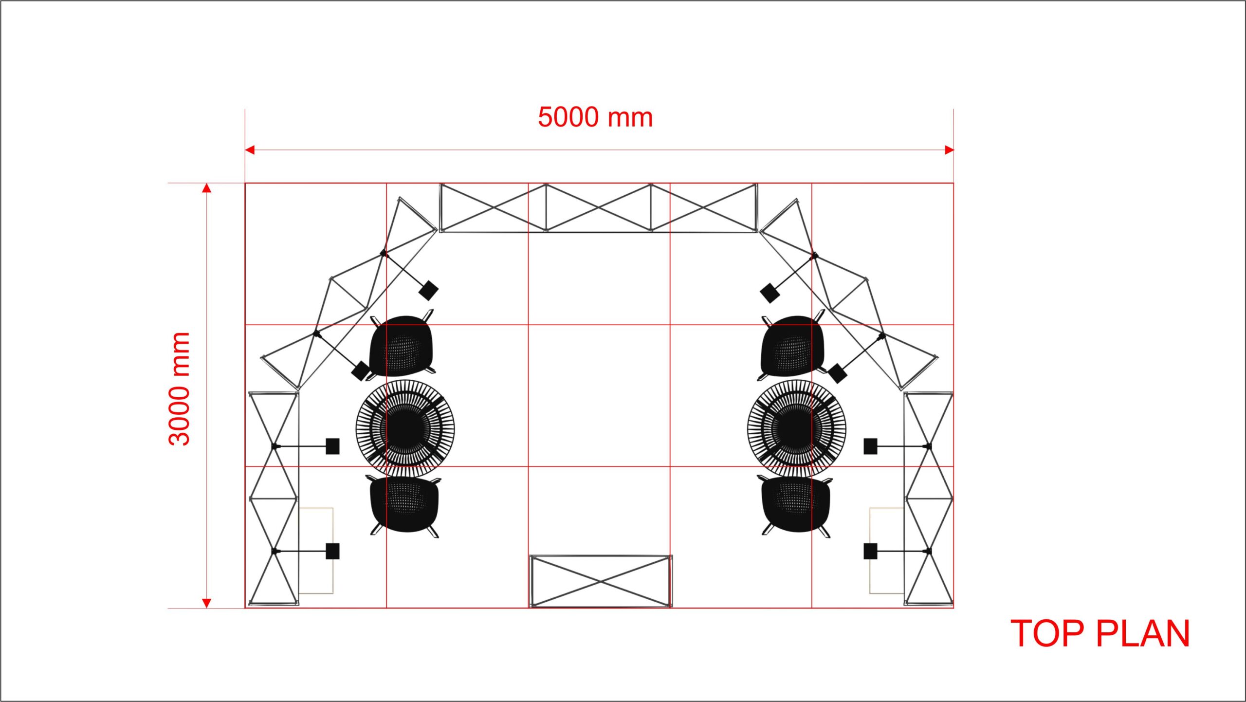 Con una longitud de 5 m. y un ancho de 4 m. este stand de 20 m² tiene un diseño abierto y es ideal para presentar sus productos y servicios en ferias.