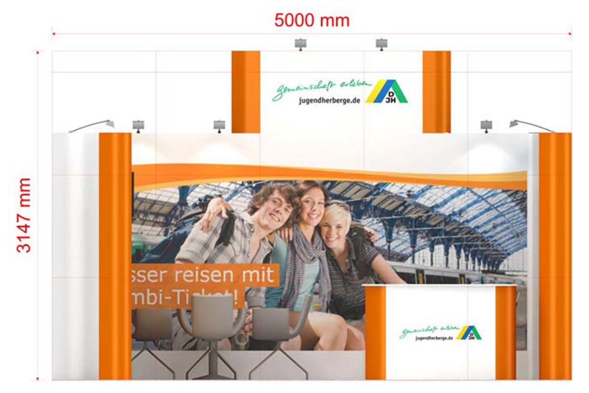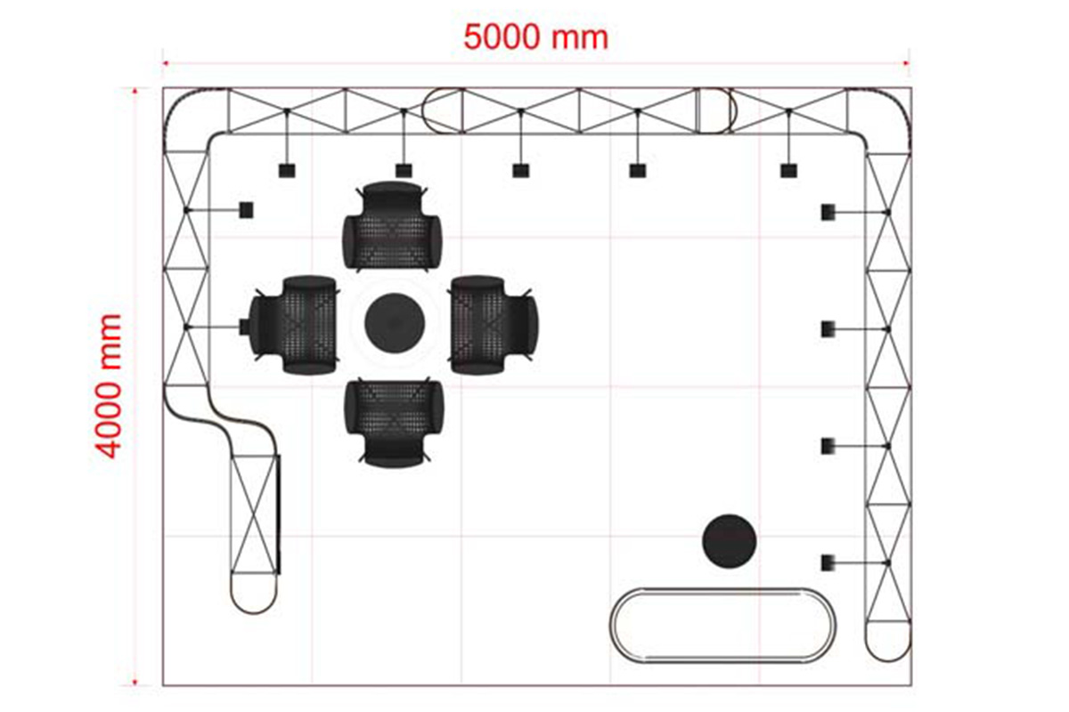 Con una longitud de 5m. y un ancho de 4 m. este stand de 20 m² tiene un diseño ideal para presentar sus productos y servicios en ferias.