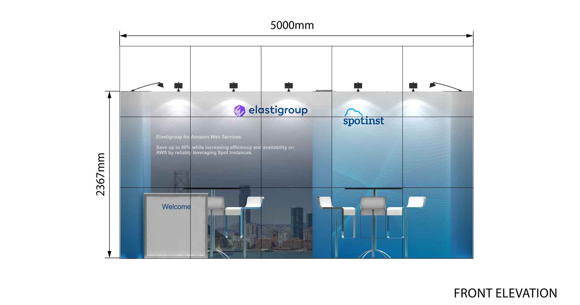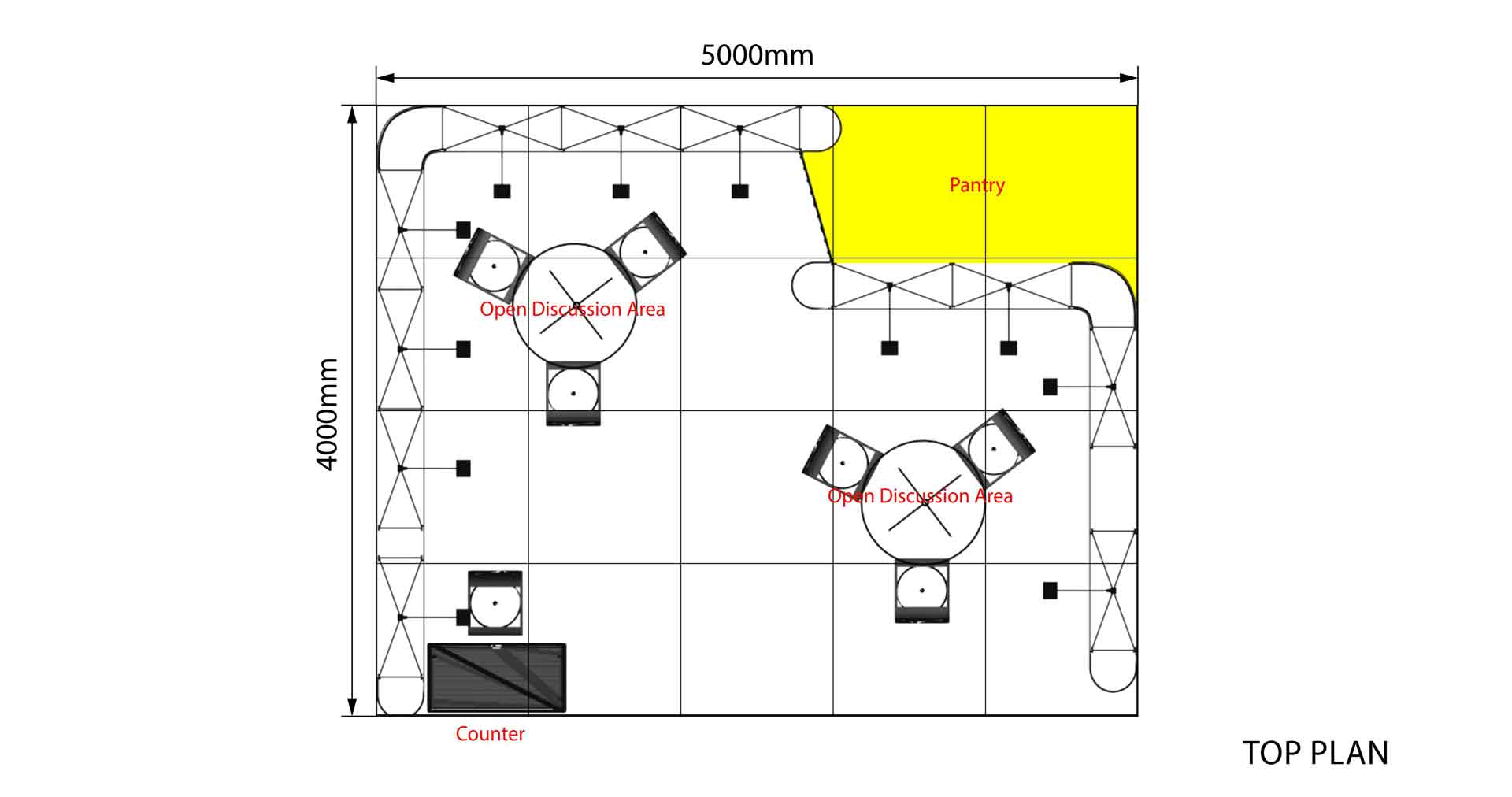 Con una longitud de 5m. y un ancho de 4 m. este stand de 20 m² tiene un diseño ideal para presentar sus productos y servicios en ferias.