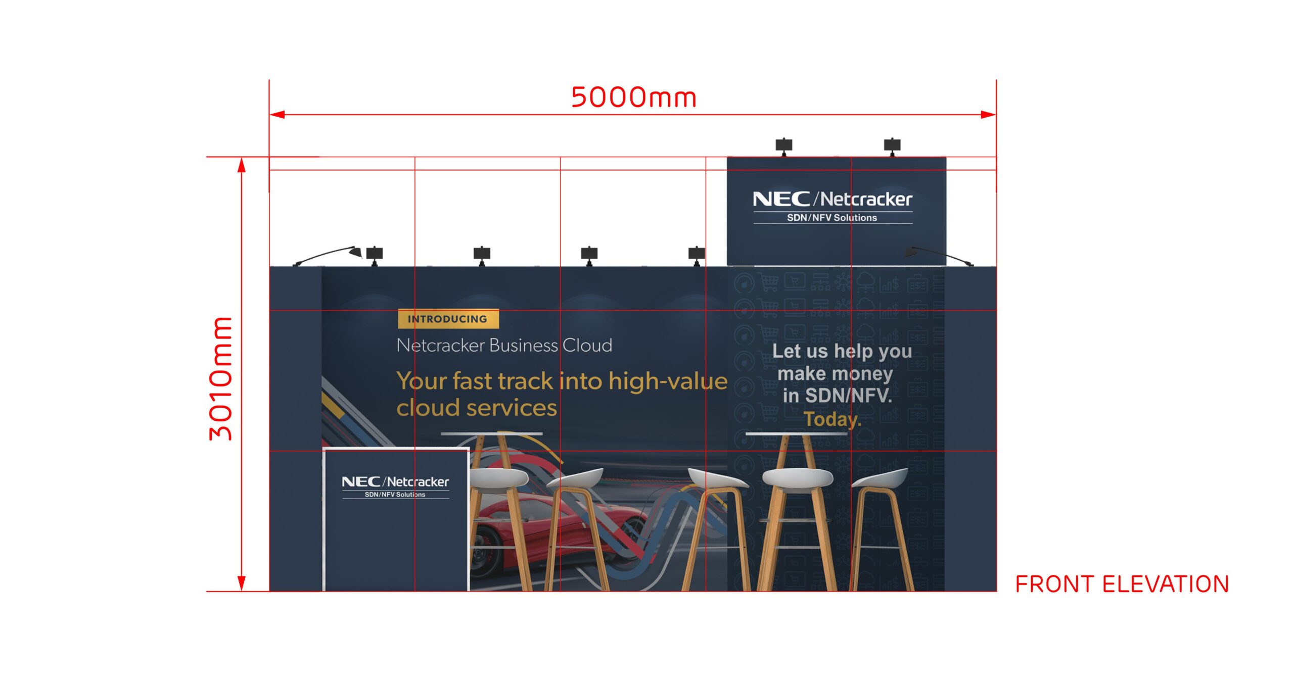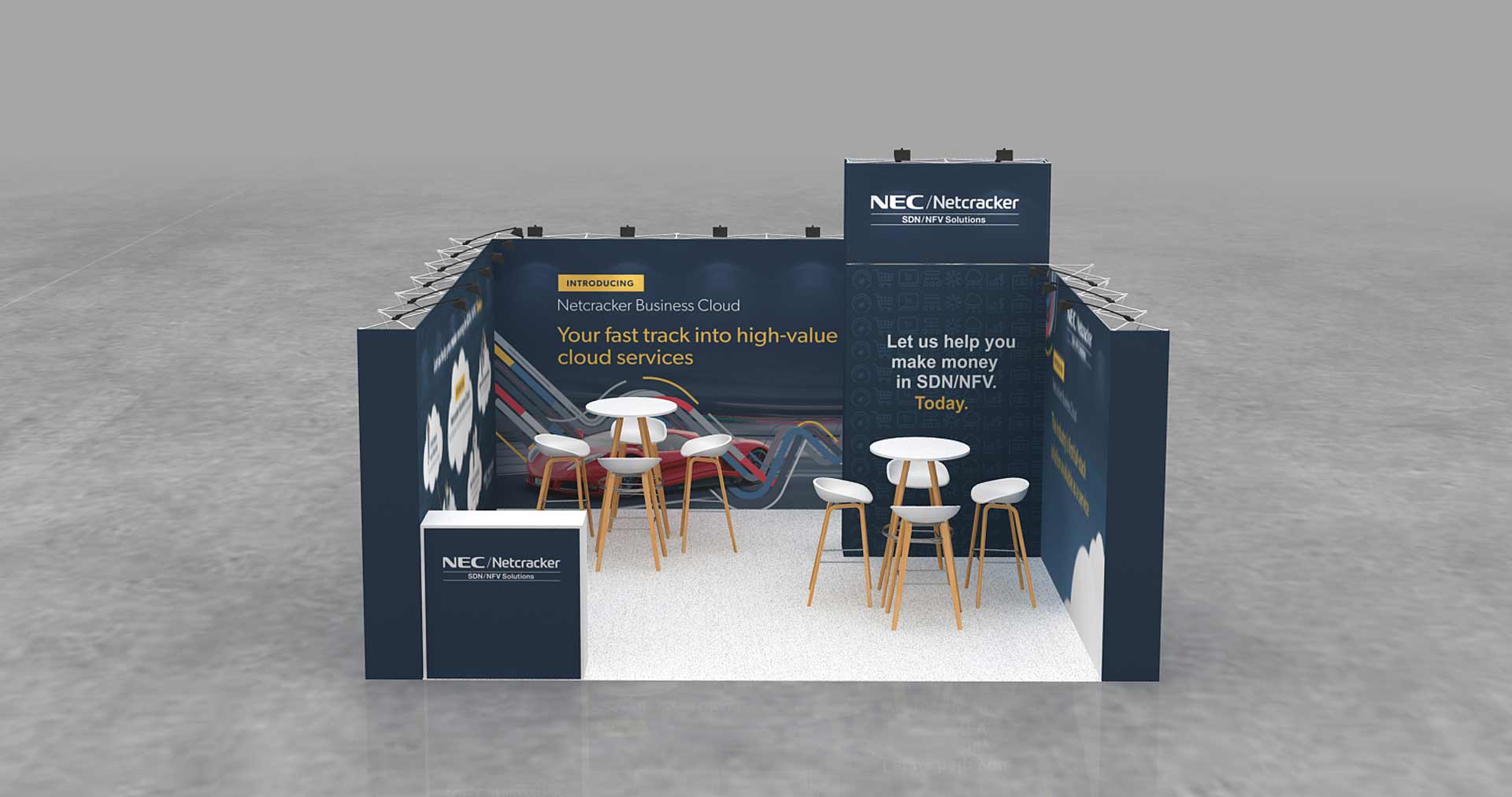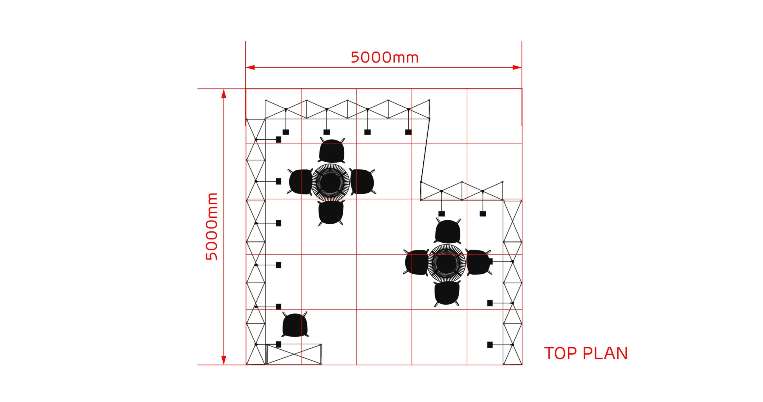 Con una longitud de 5 m. y un ancho de 5 m. este stand de 25 m² tiene un diseño abierto y es ideal para presentar sus productos y servicios en ferias.