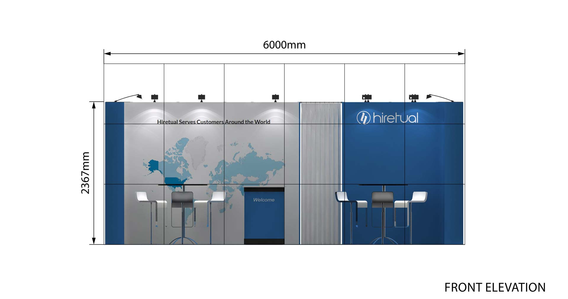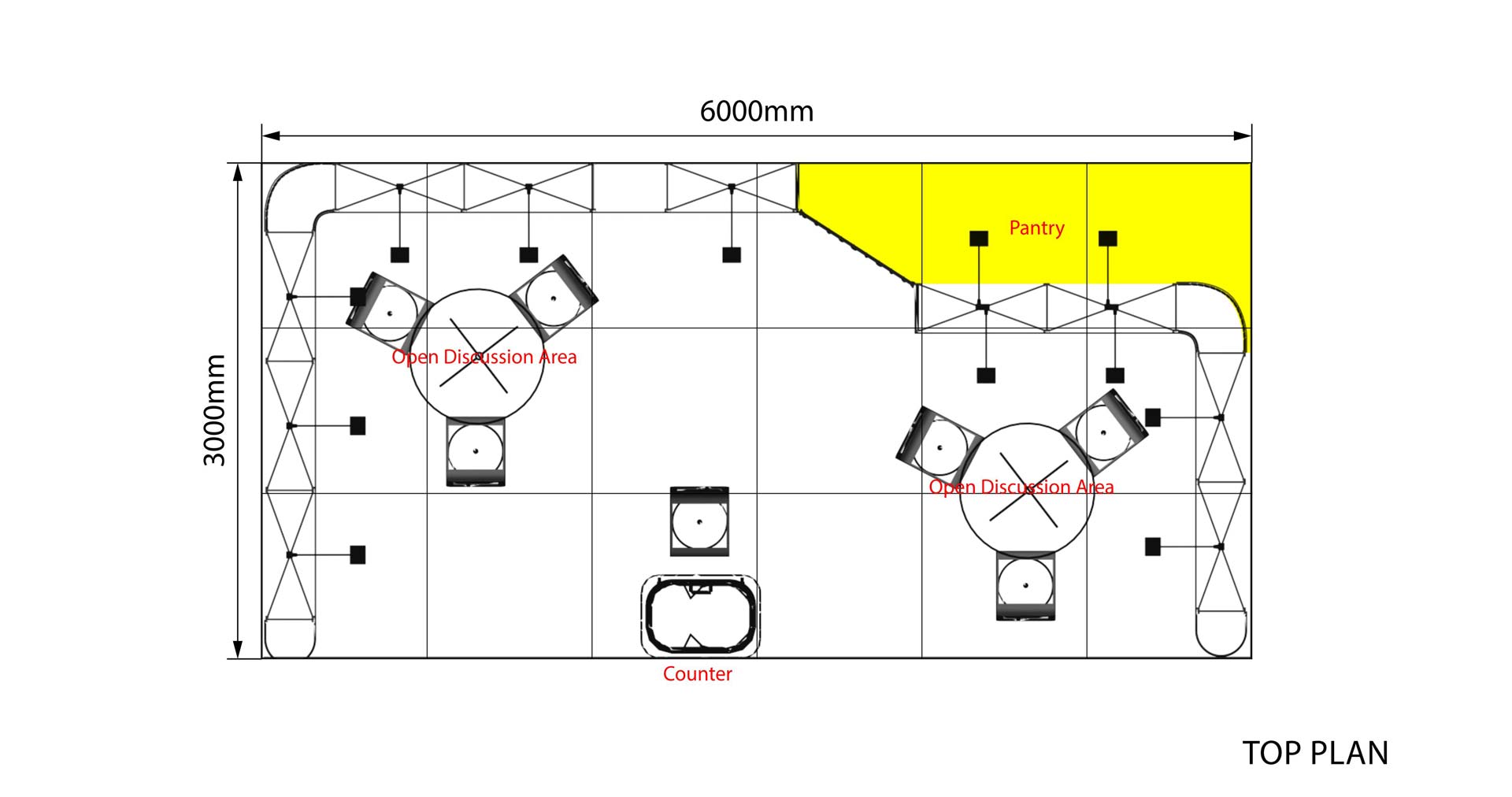 Con una longitud de 6m. y un ancho de 3 m. este stand de 18 m² tiene un diseño abierto y es ideal para presentar sus productos y servicios en ferias.