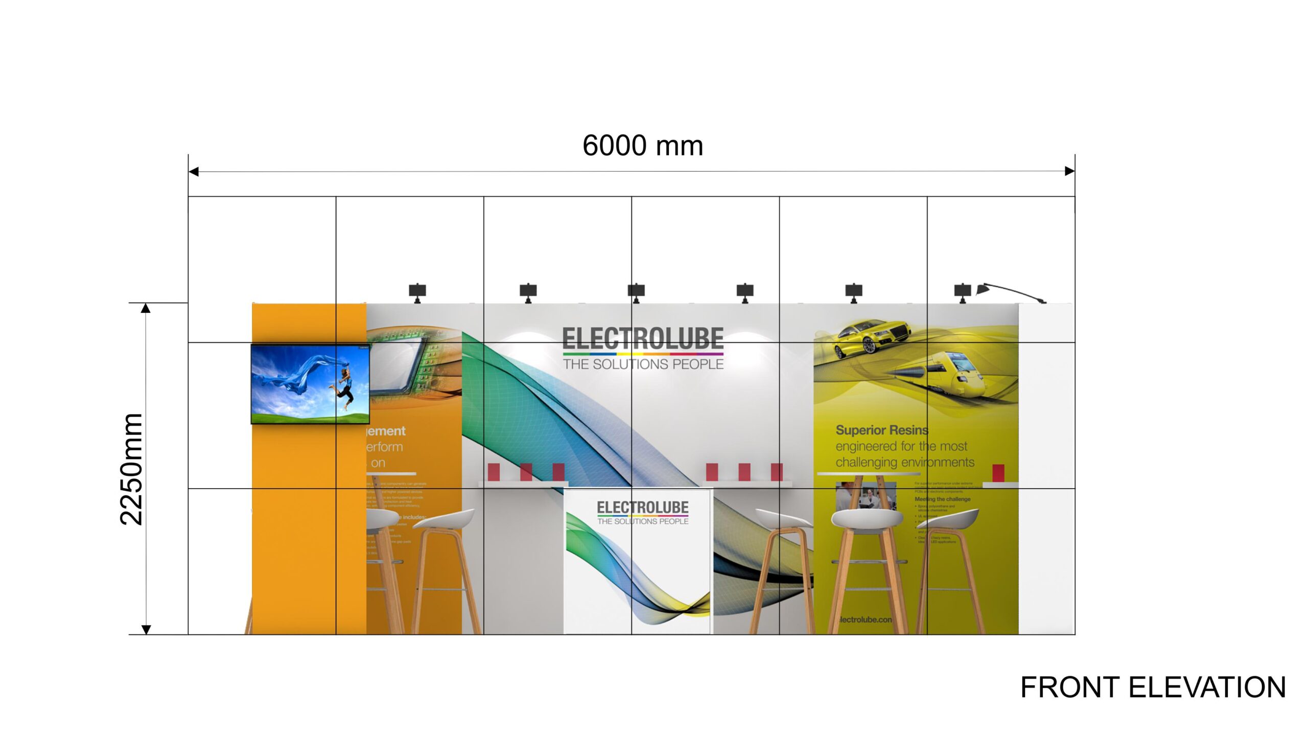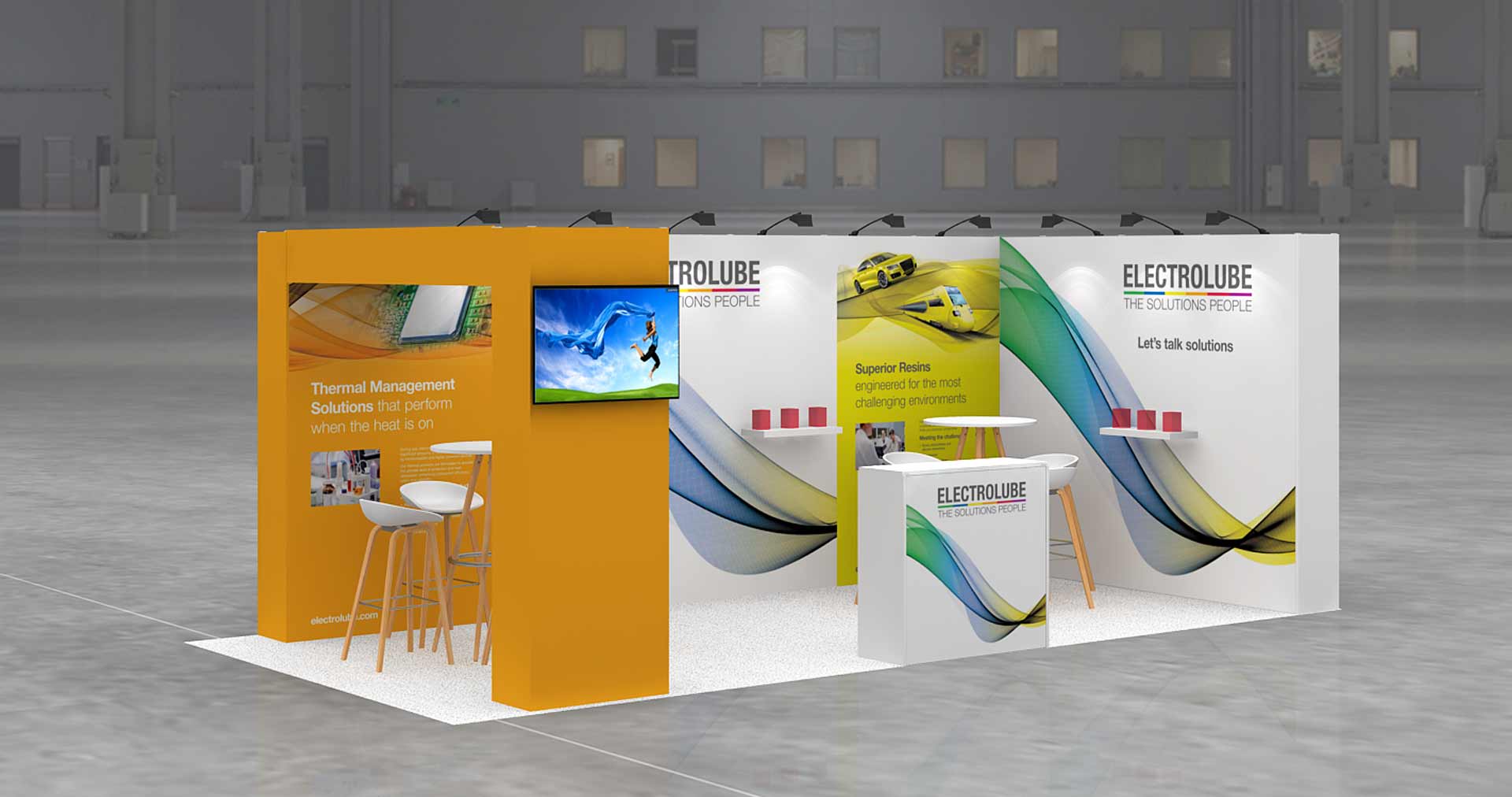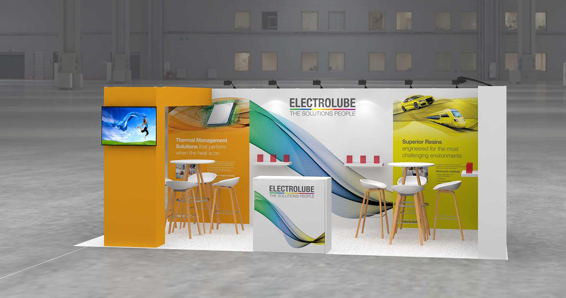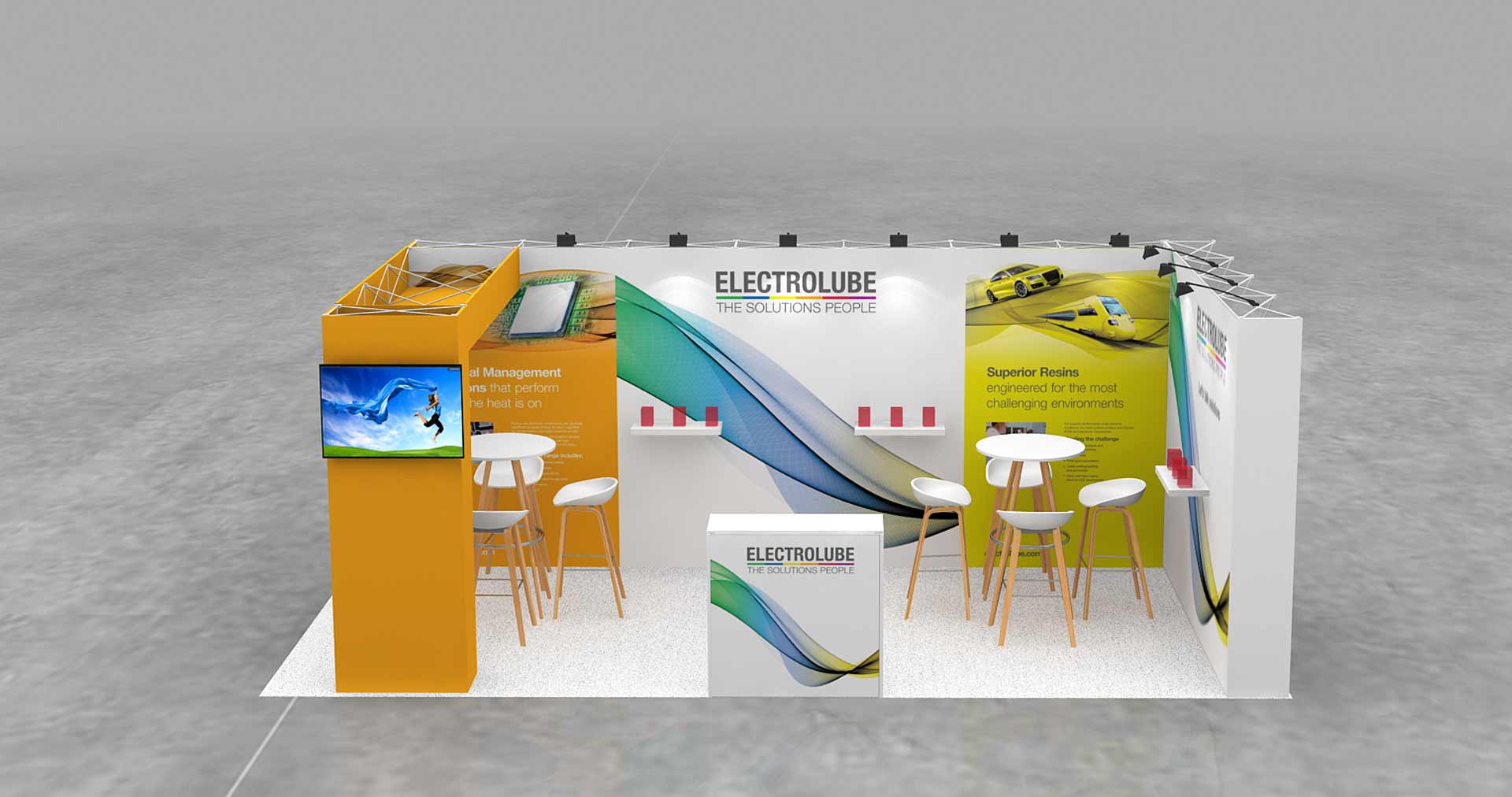 Stand en ángulo de 18 m2. Stand de 6×3 m.
