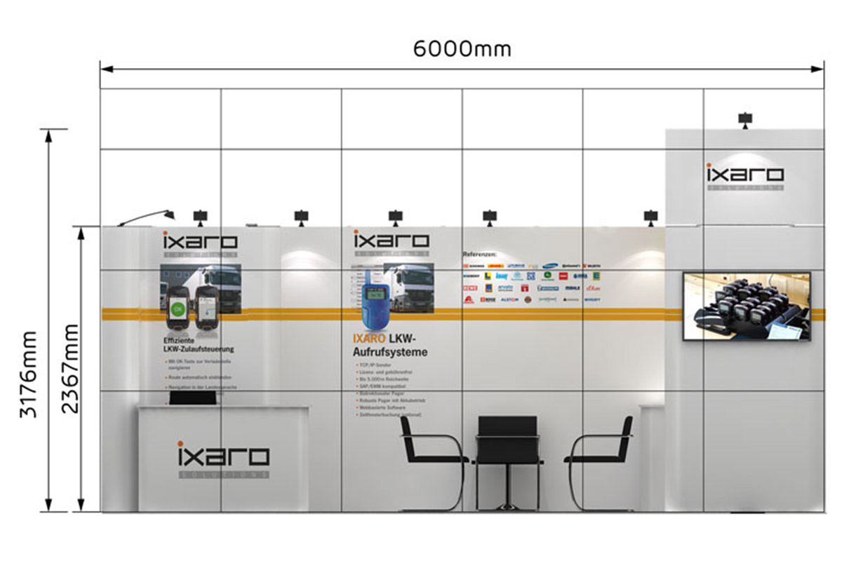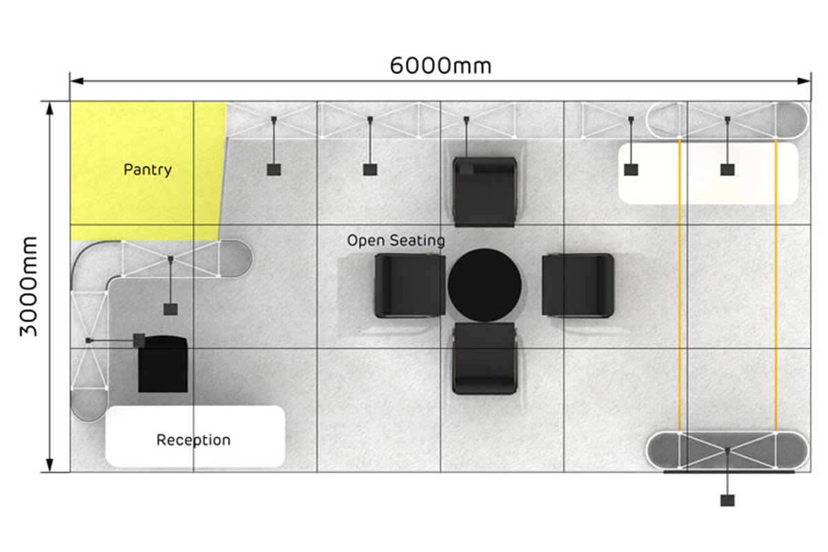 Con una longitud de 6 m. y un ancho de 3 m. este stand de 18 m² tiene un diseño abierto y es ideal para presentar sus productos y servicios en ferias.