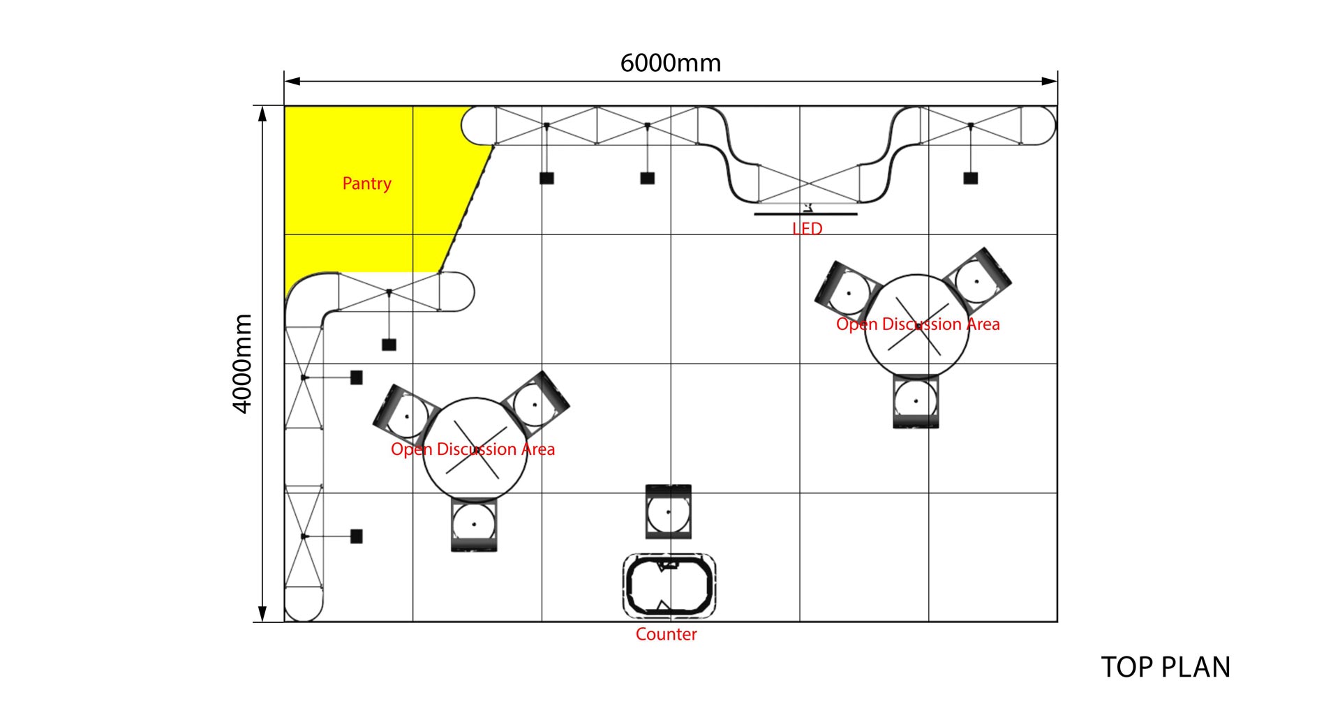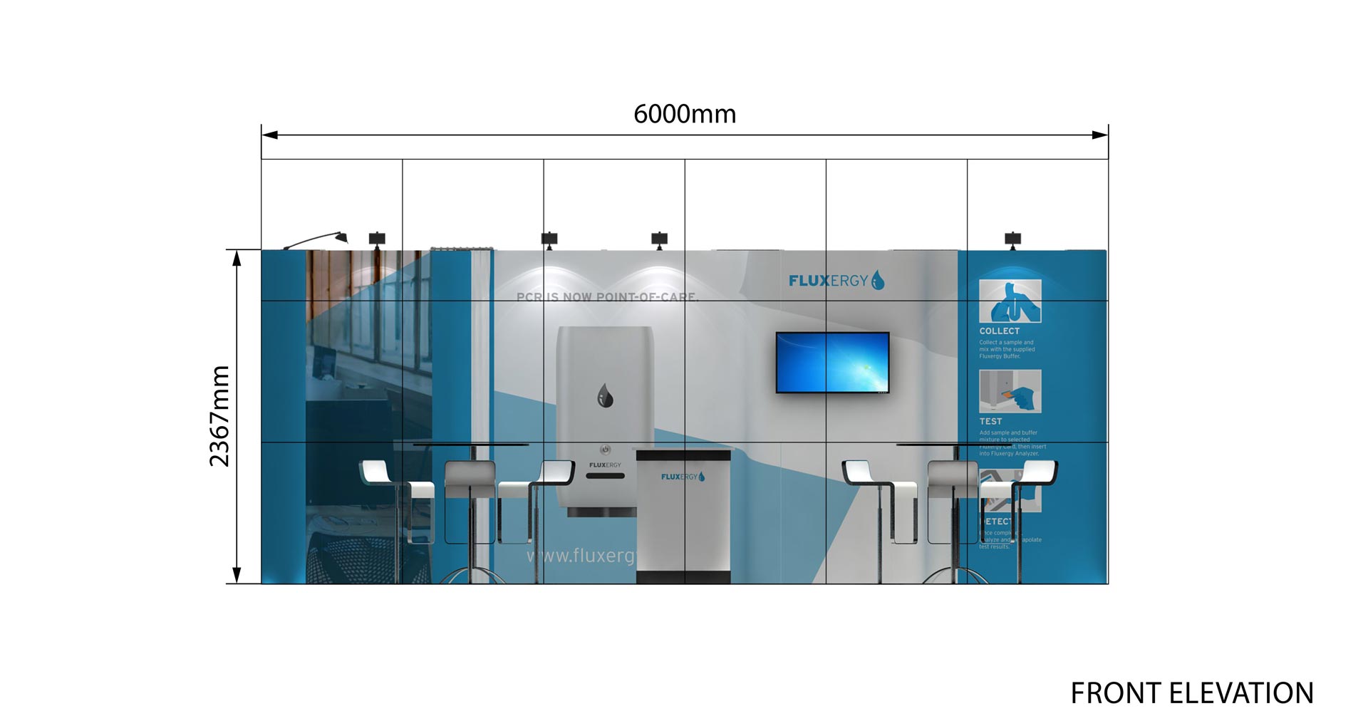 Con una longitud de 6m. y un ancho de 4 m. este stand de 24 m² tiene un diseño abierto y es ideal para presentar sus productos y servicios en ferias.